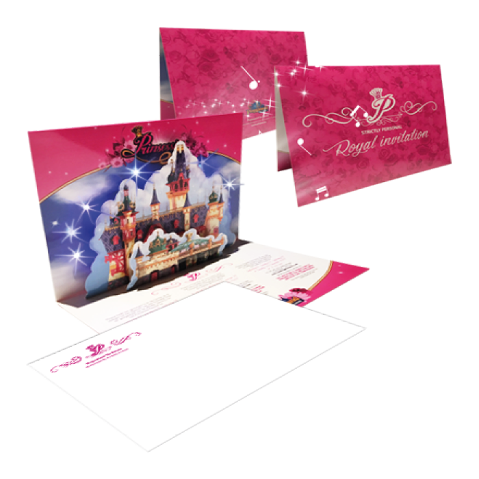 Om dit op een spectaculaire manier aan de buitenwereld aan te kondigen heeft Basisidee een muziekwenskaart ontworpen. Een kaart die die na openslaan start met de tune van Prinsessia. En om het geheel nog wat extra’s te geven hebben we de kaart voorzien van led verlichting en een 3D pop-up kasteel.
